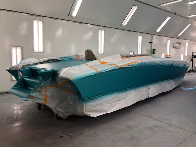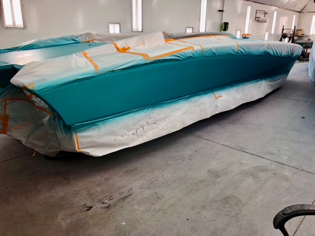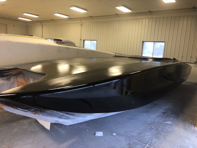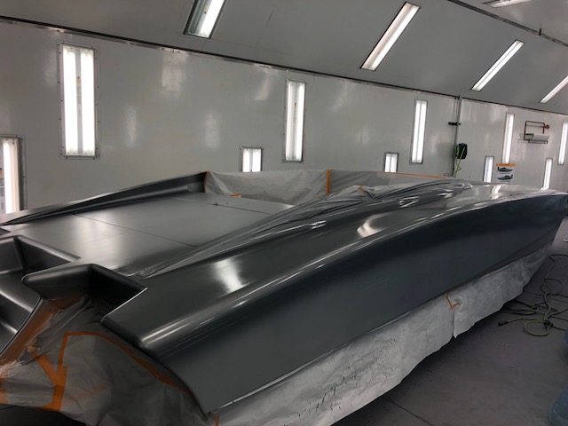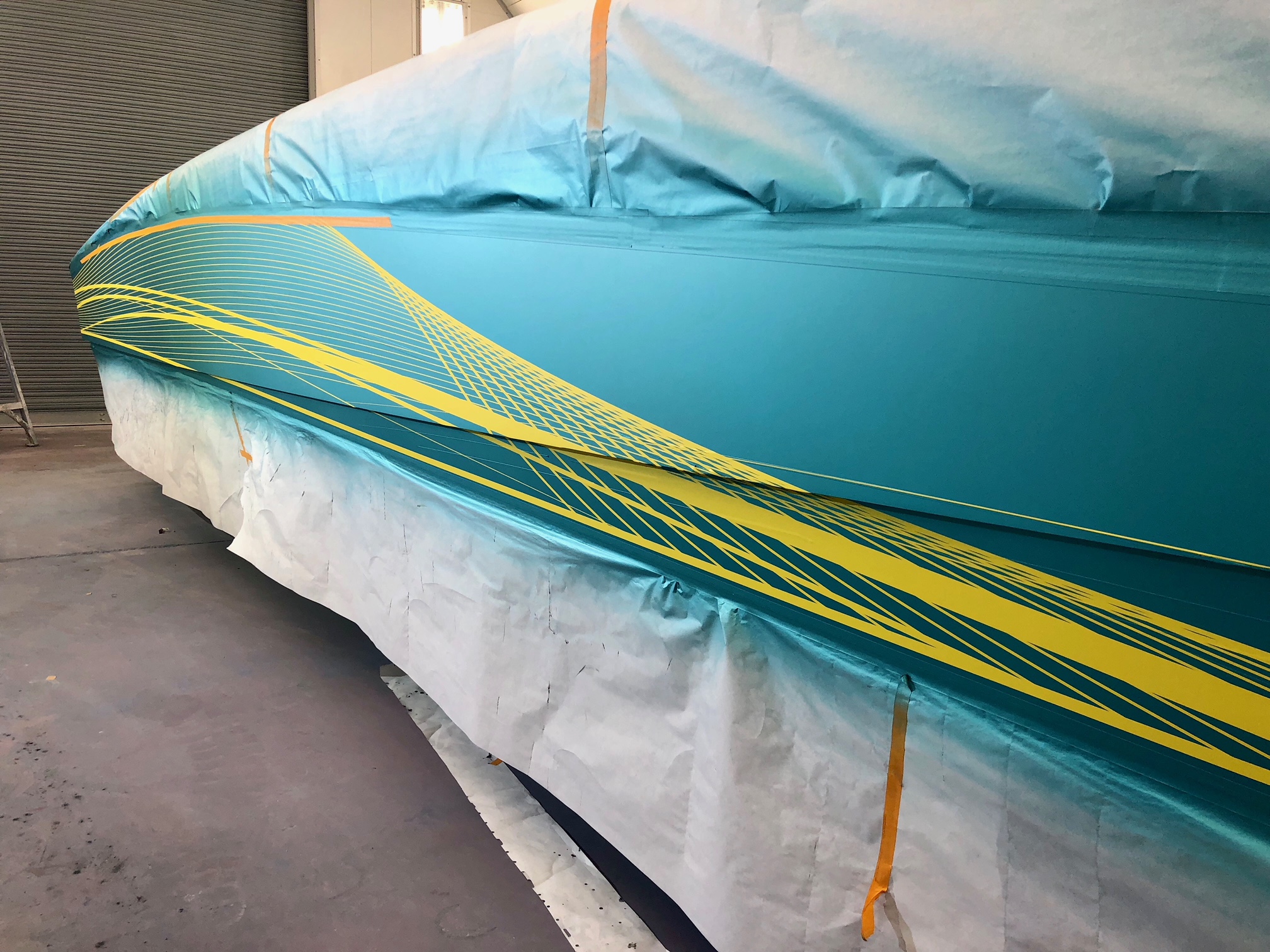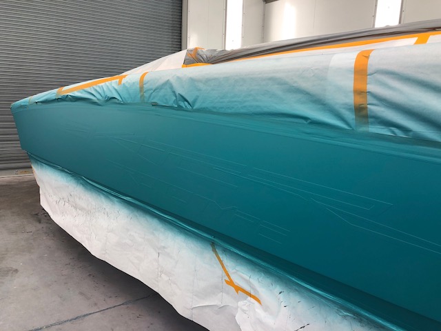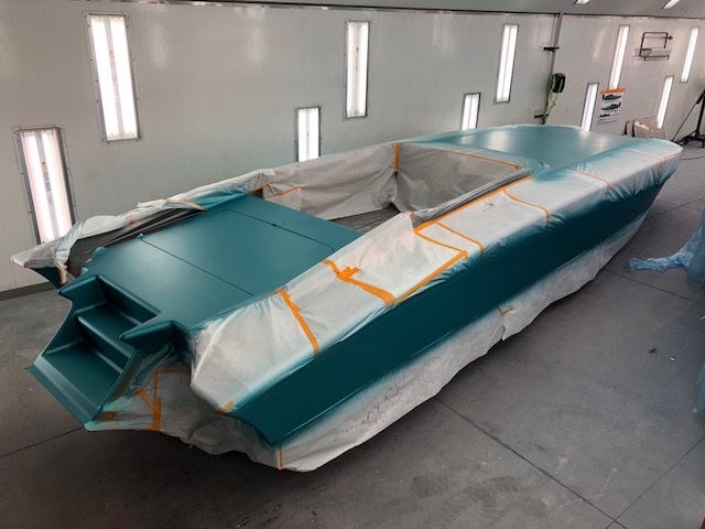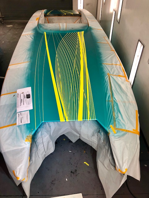 Boat Customs used a P shades program and spent over 150 hours laying down the custom finishes through six masks, ten drop layers equating to shooting over 60 different processes of laying paint on to this boat before applying 4 deep coats of Sikens aerospace clear to the finish before spending an entire week color sanding and polishing. The whole process takes 5 weeks to finish and we’re looking forward to seeing the finished product!