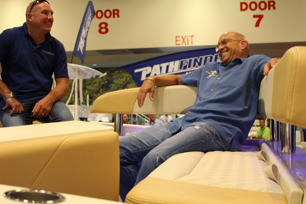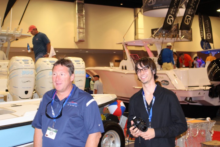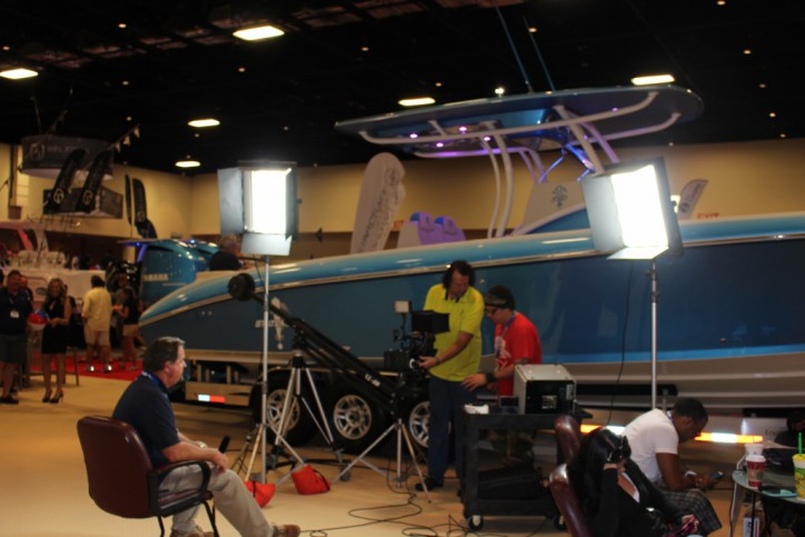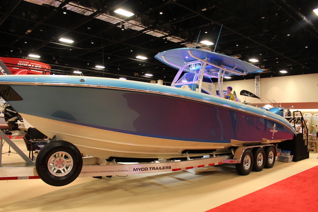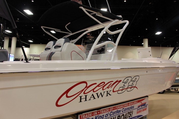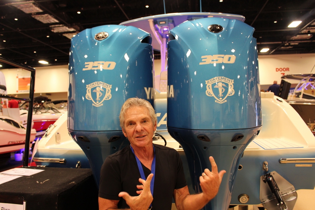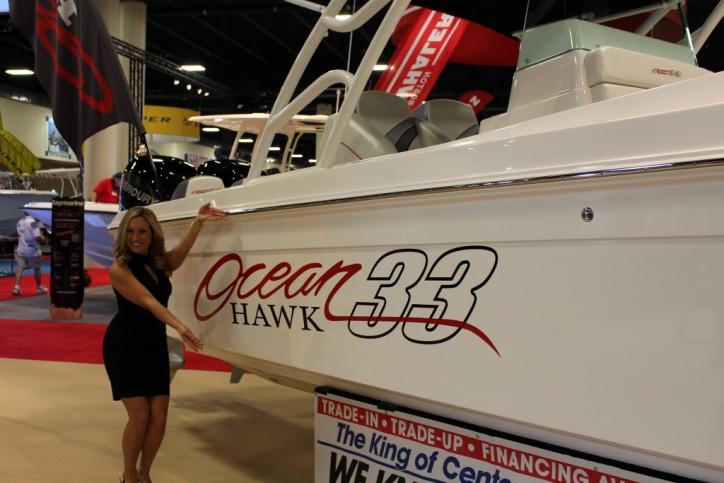 nside the Convention Center, Statement, was certainly making one with a great display in the center of the show with Boats Direct USA who in addition to Statement had their new 399 Deep Impact on display as well as the newly revitalized Ocean Hawk 33. Overall theme from these guys. “Cant build them fast enough!” Check out our interview below with Monique and Mark from Boats Direct USA: