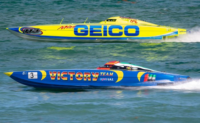In a virtually unheard of series of events, two Class One offshore competitors—the Victory and Miss Geico race boats—rolled over within seconds of each other during the final two turns of the 35th Sarasota Powerboat Grand Prix, dramatically bringing the day’s worth of racing to an abrupt conclusion.