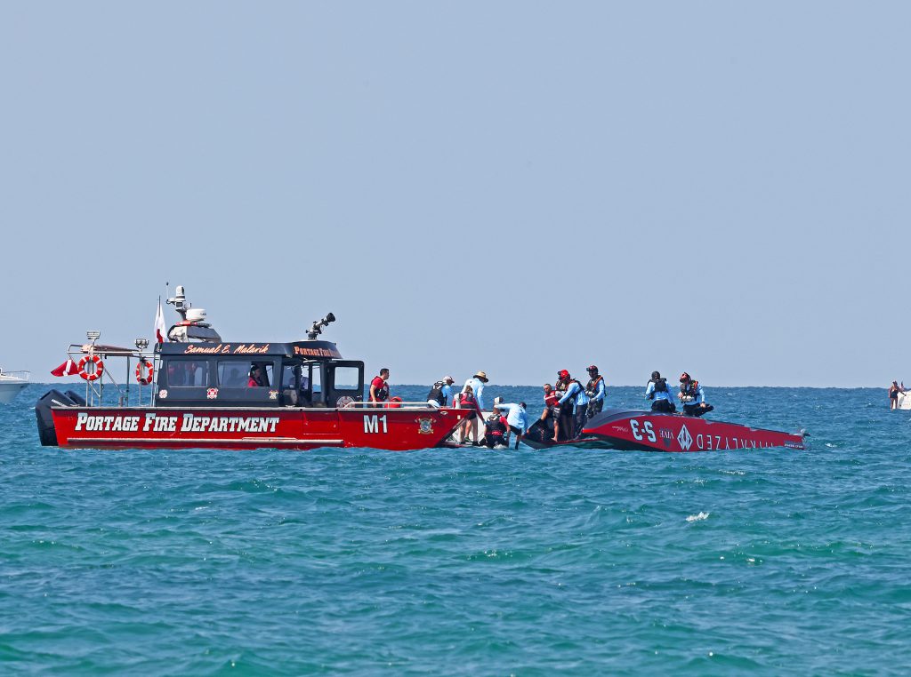 Most of the time, they just follow the boats around the course, lap after lap, for every race. They don’t often have to deploy as offshore racing accidents are rare relative to the numbers of races and boats during a given race weekend. But they did last Sunday when the 32-foot canopied Super Stock-class Mikalyzed catamaran carrying owner/driver Pete Riveiro and throttleman Ricky Maldonado rolled in a turn during the XINSURANCE Great Lakes Grand Prix in Michigan City, Ind.