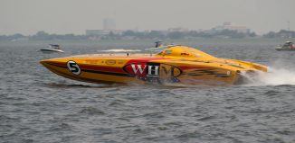 The second of three SBI races in Clearwater consisted of a pair of classes running simultaneously: Superboat and Superboat Stock. WHM Motorsports, with owner/driver Billy Mauff and throttleman Jay Muller, led most of their Superboat competitors throughout the race, with Performance Boat Center/Jimmy John’s, M-CON and AMH Motorsports jockeying for the remaining podium positions. Cleveland Construction, which crashed in August’s Michigan City race in Indiana, arrived repaired and apparently ready to race, but opted out for reasons that were not immediately clear. Toward the beginning of the race, competitors NZ-1 Pro Floors Racing, featuring driver Wayne Valder and throttleman Chris Hanley of Auckland, New Zealand, flipped their boat upside down, but managed to escape the boat on their own without serious injuries.