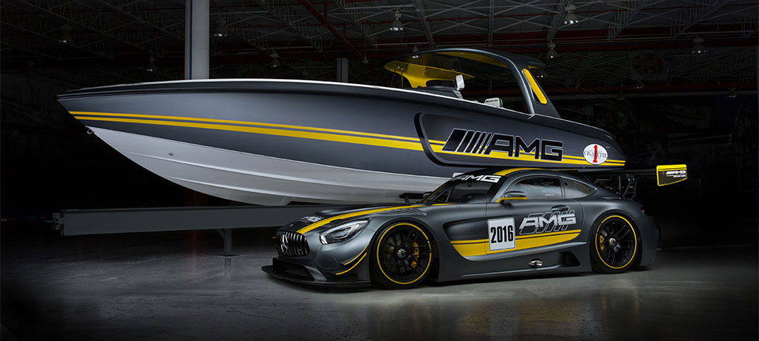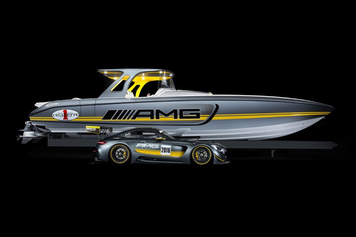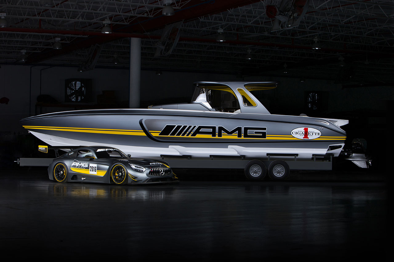 Miami, FL – Two legendary brands will unite once again at the Miami International Boat Show on February 11, 2016. Mercedes-AMG and Cigarette Racing join forces for the sixth consecutive year to present the Cigarette Racing Team 41’ SD GT3 boat inspired by the Mercedes-AMG GT3 racecar. As the most powerful “open performance” boat ever produced by the Cigarette Racing Team, the 41’ SD GT3 marries the characteristic styling and thoroughbred motorsport technology of the Mercedes-AMG GT3 that will be on display alongside it.
