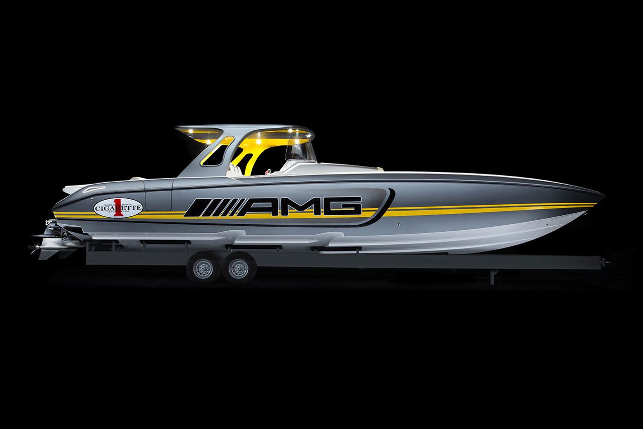 Mercedes-AMG and Cigarette Racing began their collaboration partnership in 2007, primarily for organizing joint customer and marketing activities. Whether on land or water, Mercedes-AMG and Cigarette Racing are united by their focus on delivering the ultimate in performance. Similar to its Mercedes-AMG super sports counterpart, the 38’ to 50’ long powerboats from the American specialists are among the world’s fastest and most exclusive machines. These boats feature custom-made, handcrafted quality for enthusiasts and are tested under the most extreme conditions. Mercedes-AMG and Cigarette Racing share similar DNA makeups: both companies have triumphant racing roots and are still dedicated to this passion.