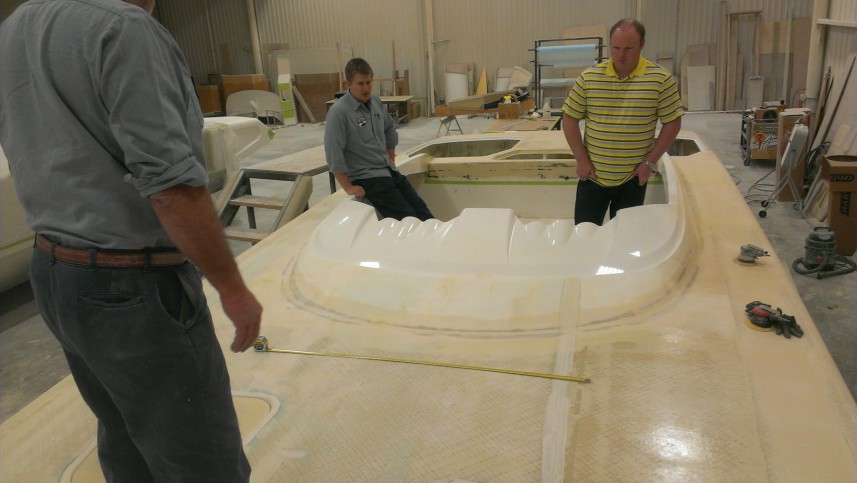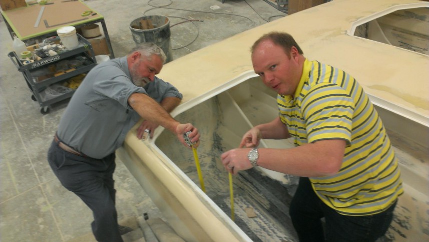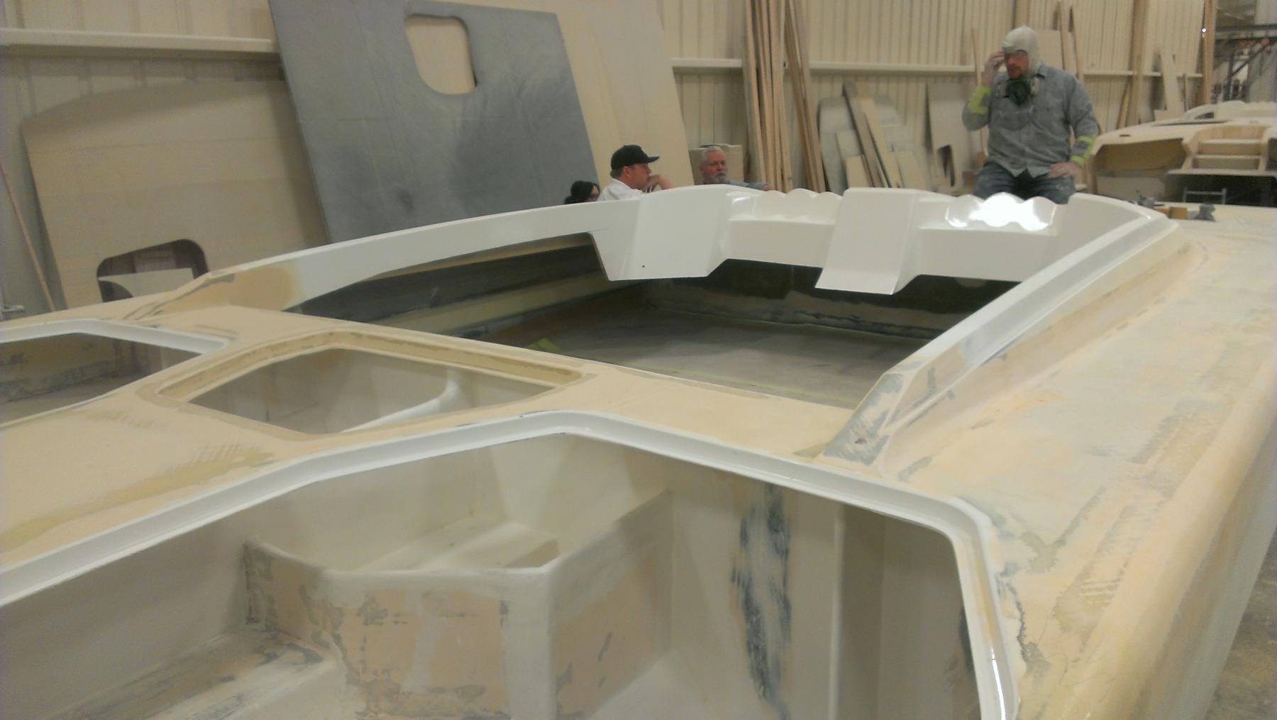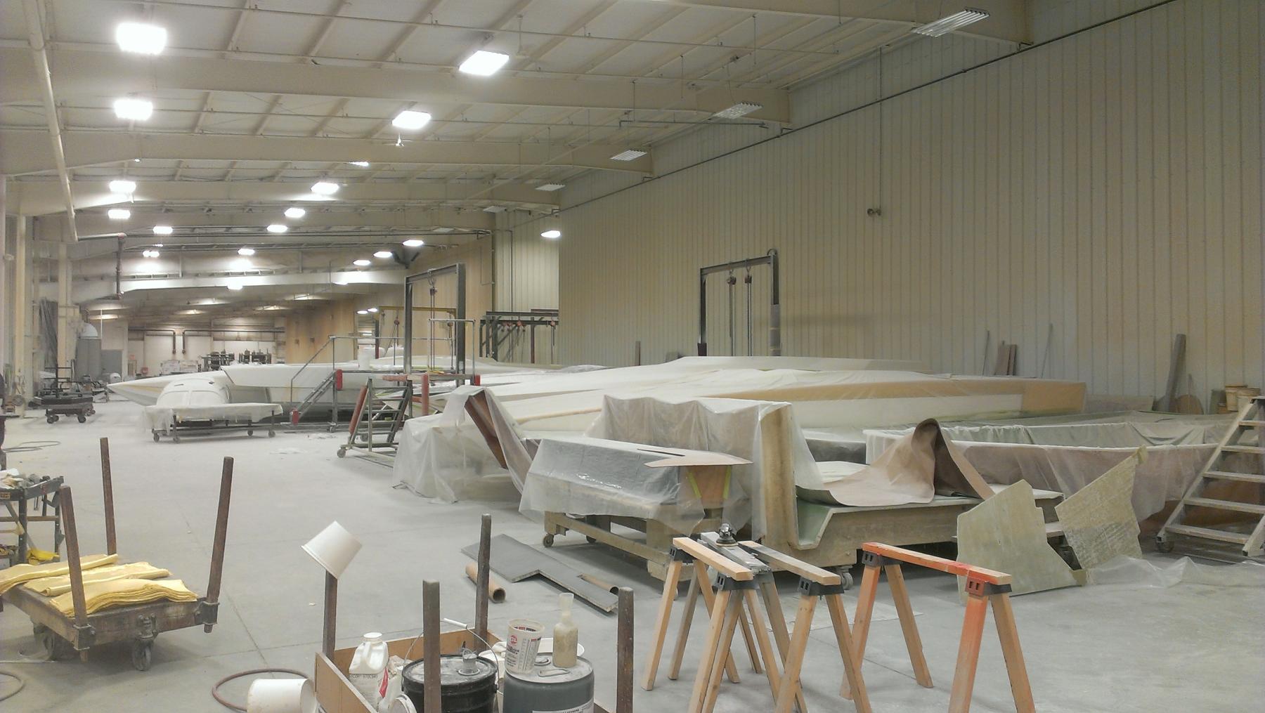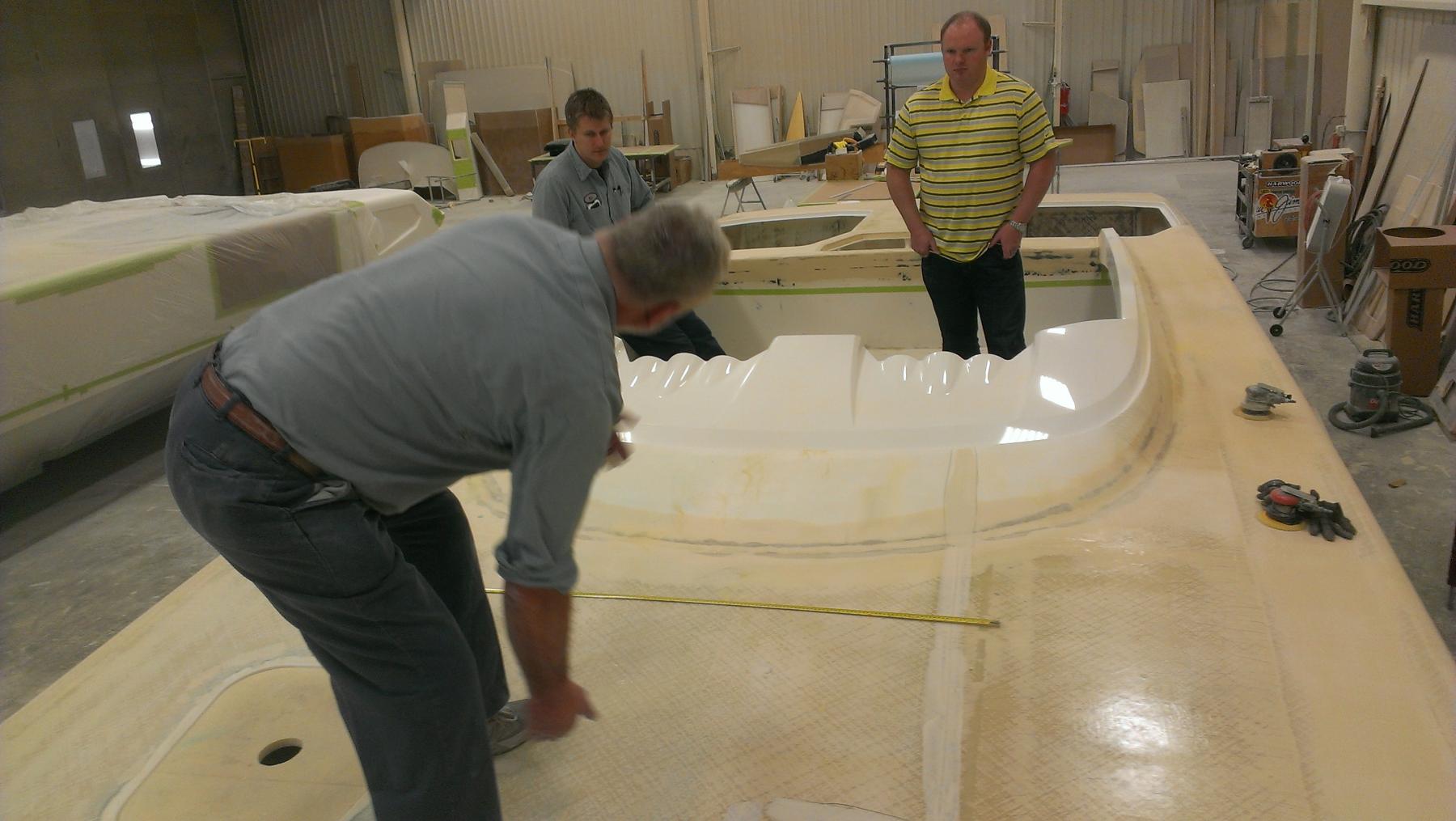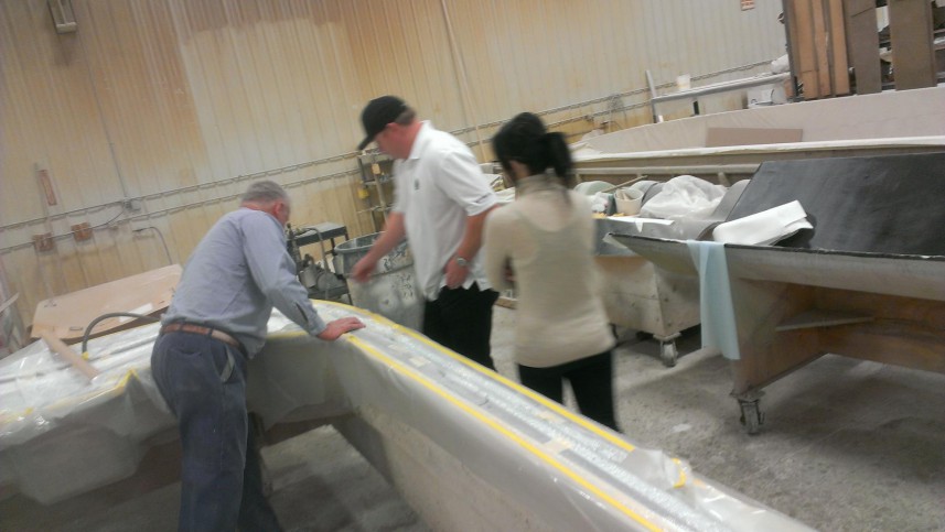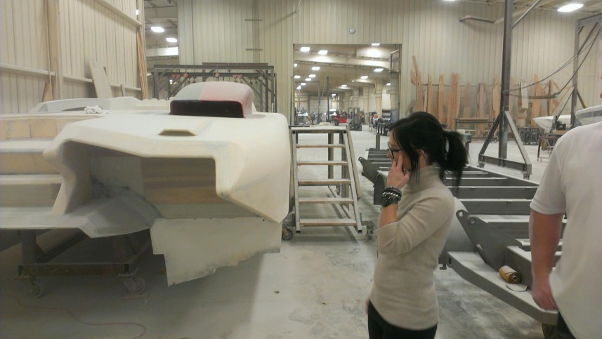 Last week PowerBoat Nation made its third trip in four months back to Skater to ride along with the 388 Platinum build project. This trip included the Rainmaker Crew, Chris and Angela Bradley. Braving miserably cold conditions they met with Peter and some of his crew to go over many of the particular details of the build for what will be the new RAINMAKER which will be hull number 3 for the 388 Platinum builds.