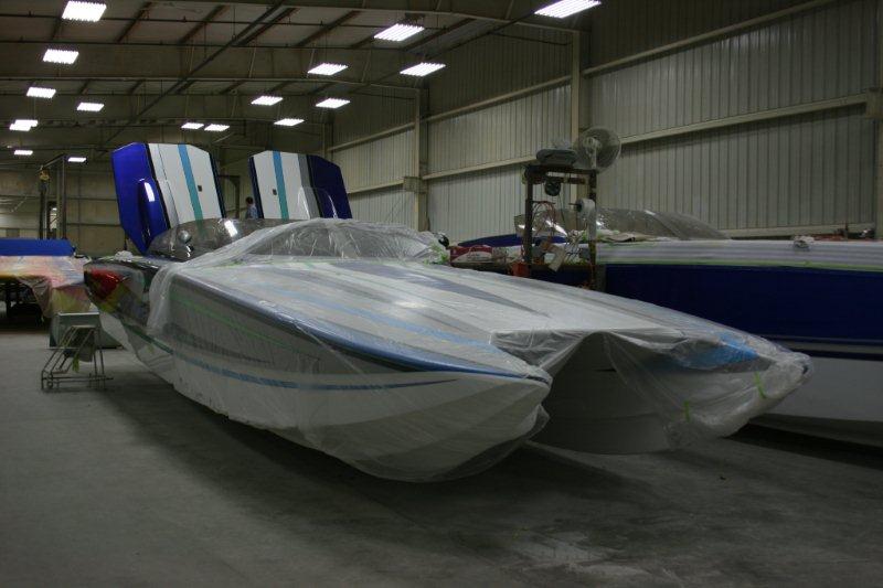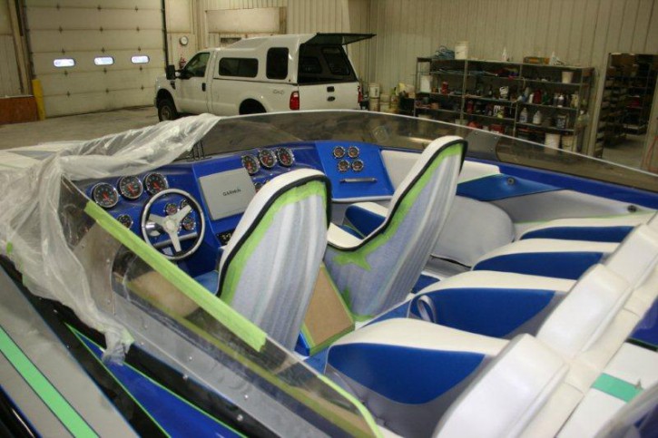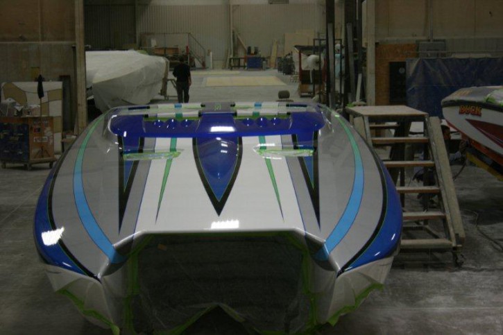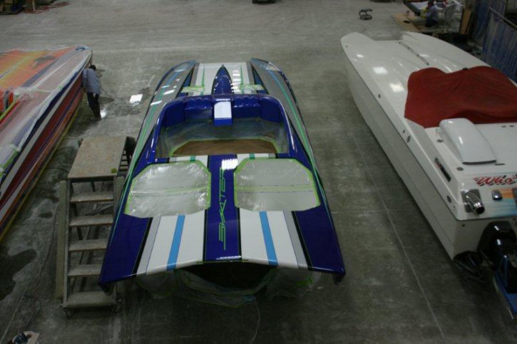 One new custom powerboat masterpiece headed for the Miami Boat Show is the all new Skater 338 “Fat Boy” Based on a widened version of the blistering fast 30′ Skater “PROTOTYPE” with a new style dash configuration and a full wrap around windshield. The custom build was commissioned by Mr. Louie Marchese. Louie has one formidable desire and that is to build this boat as a LOTO shoot out statement maker in the under 35 foot class. Louie is no stranger to this event as he throttled a 28′ Nordic SS at LOTO to a 148 mph run back in August. Now looking to break his own record Louie did a lot of homework before he landed at Skater with his plan to build this purpose built water rocket.