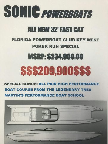 Sonic is all in for this years Key West Poker Run and signed on as a major Florida Powerboat Club Sponsor. Two 32 Super Cats rigged with Mercury Racing 400R’s will be at Key West, and another is nearing completion with 565’s, turning IMCO SCX Drives. The newest 32 Super Cats at Key West this year is being offered with incredibly aggressive pricing and a session with the Tres Martin Performance Boat School is included!
