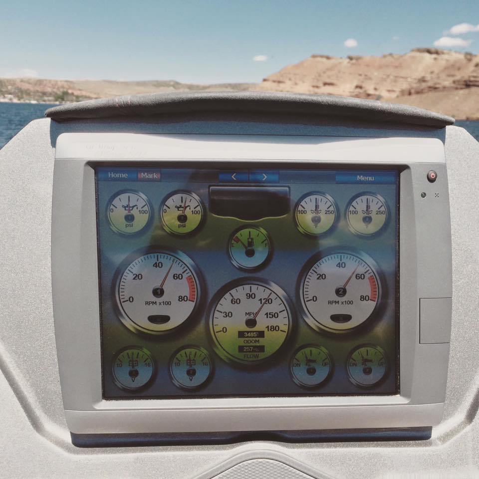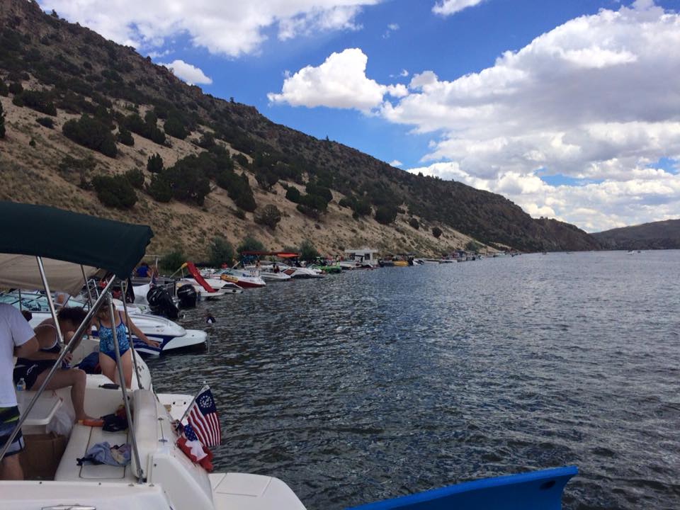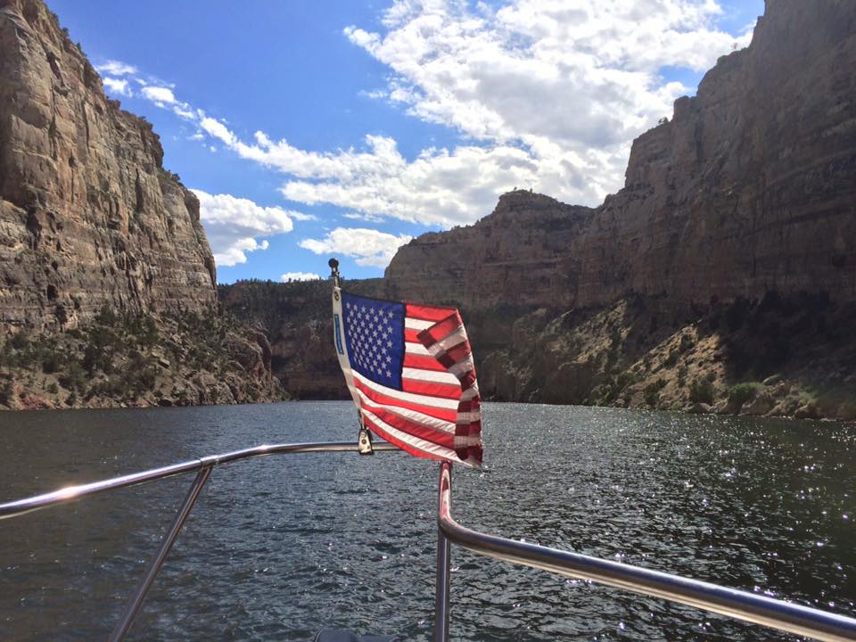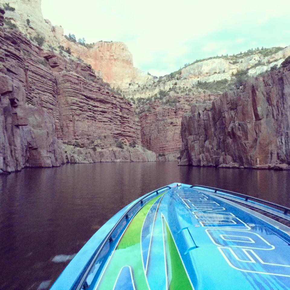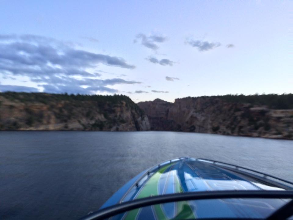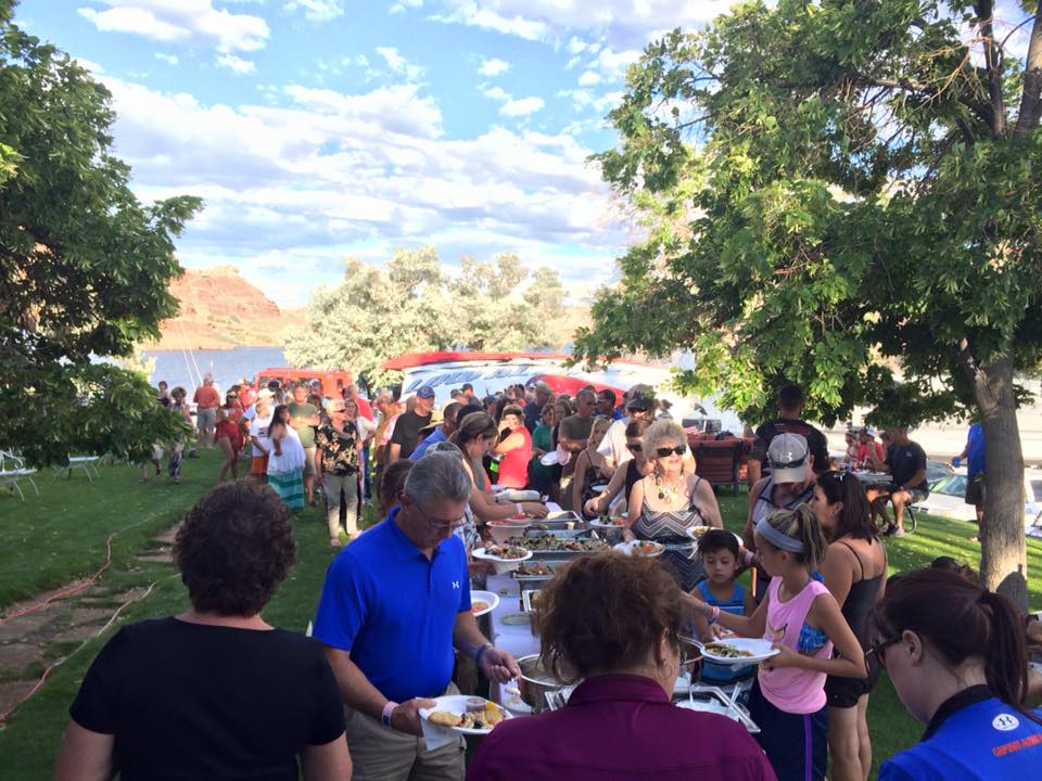 But, let’s get back to the charity event. Team Farnsworth had their 41’ M41 Widebody DCB on the water offering rides to anyone that donated to Jason’s Friends. It was estimated that more than 35 rides were given, to approximately 120 people over 3 days. On Saturday morning, the poker run started. We used another one of Win’s boats, “Old Blue” as he refers to her (a mid 1990’s Bayliner cruiser with twin 454’s) to do the run. This was a poker run like no other I have participated in. First off, idle speeds were maintained during the entire run. This was mainly in part due to the fact that most of the boats on the lake were 1, a sailboat, 2, a cabin cruiser, or 3, looked like what I can only describe as a 1960’s travel trailer on the water. Nonetheless, even with the lack of high speed between stops, everyone had a great time. A raft up on the lake’s beach boasted more than 80 boats, and a lunch buffet was served to all participants. The water in the lake is crystal clear and is surrounded by beautiful rock cliffs and canyons.