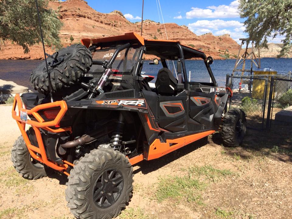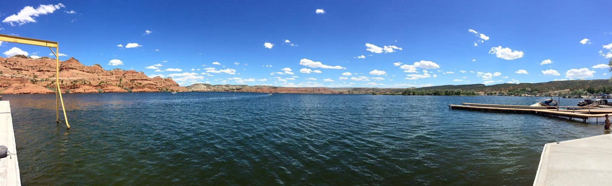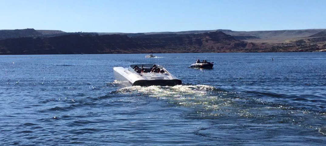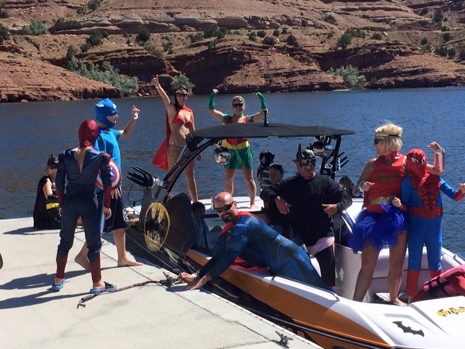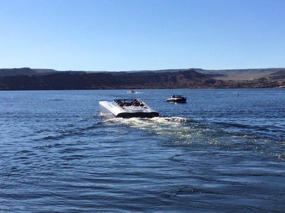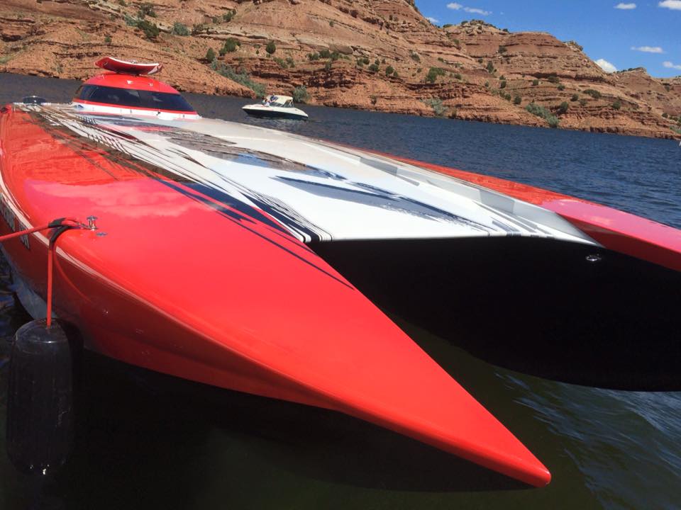 But, let’s get back to the charity event. Team Farnsworth had their 41’ M41 Widebody DCB on the water offering rides to anyone that donated to Jason’s Friends. It was estimated that more than 35 rides were given, to approximately 120 people over 3 days. On Saturday morning, the poker run started. We used another one of Win’s boats, “Old Blue” as he refers to her (a mid 1990’s Bayliner cruiser with twin 454’s) to do the run. This was a poker run like no other I have participated in. First off, idle speeds were maintained during the entire run. This was mainly in part due to the fact that most of the boats on the lake were 1, a sailboat, 2, a cabin cruiser, or 3, looked like what I can only describe as a 1960’s travel trailer on the water. Nonetheless, even with the lack of high speed between stops, everyone had a great time. A raft up on the lake’s beach boasted more than 80 boats, and a lunch buffet was served to all participants. The water in the lake is crystal clear and is surrounded by beautiful rock cliffs and canyons.