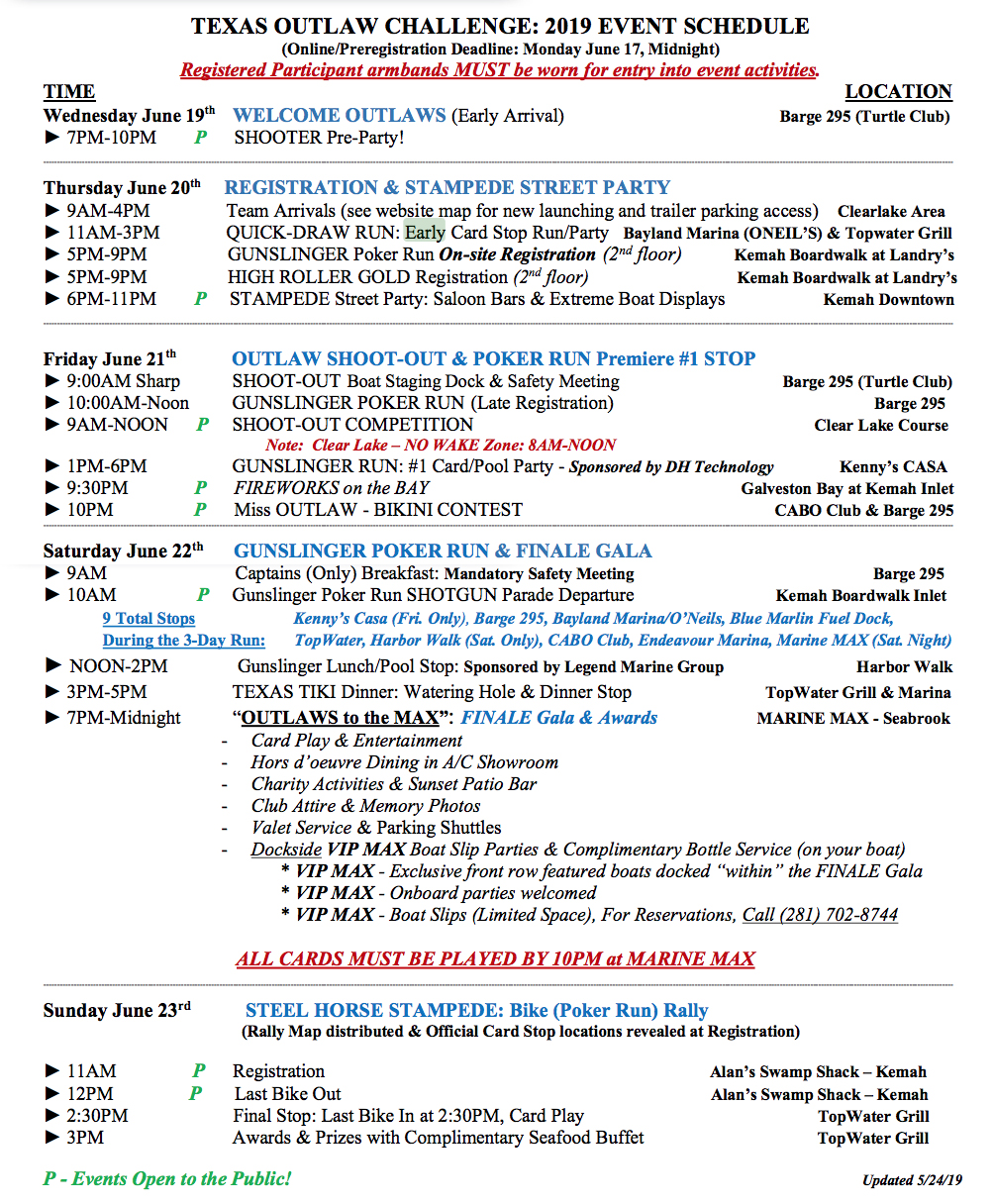 The Gunslinger Poker Run will feature nine total stops during the three-day run: Kenny’s Casa (Friday only), Barge 295, Bayland Marina/O’Neils, Blue Marline Fuel Dock, TopWater, Harbor Walk (Saturday only), CABO Club, Endeavour Marina, and Marine Max (Saturday night).