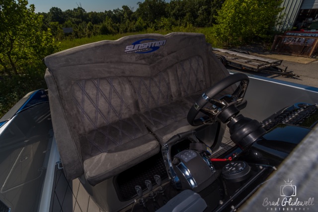 Sunsation has also modified the full fiberglass top to actually provide lift characteristics to the boat and make it become a functional piece of how the boat rides and handles. Running triple 400R Mercury Racing outboards has pushed the boat to a top speed of 90.999 MPH with a special setup.