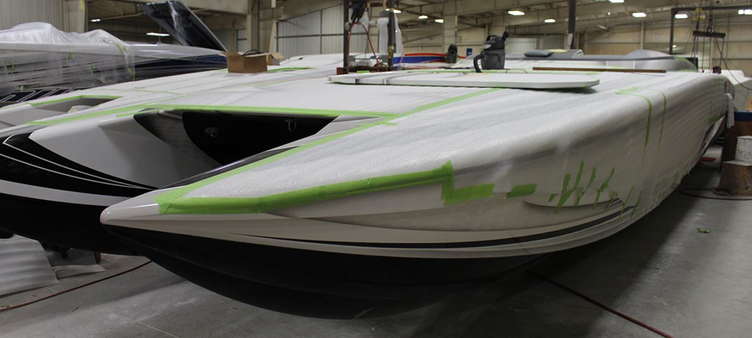 The final stages of the next Platinum Edition 388 coming from Skater Powerboats are underway. This 388 has returned from paint at TOAD and the rigging process begins. Fitment of the 1850 Goodwin Competition engines, hanging the drives, dash layout, and design and construction of the custom interior are all in the works.