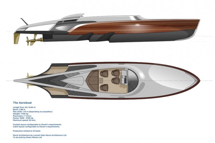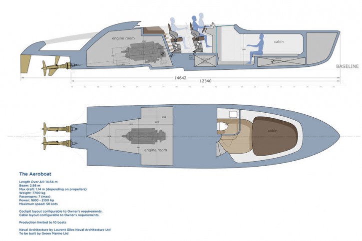 The Aeroboat, of which only 10 are set for production, boasts a supercharged Rolls-Royce Merlin V12 that reaches a horsepower output in excess of 2,500 HP, pushing the boat to speeds as fast as 75 knots. Other contributing factors that elevate the boats performance come in the form of a lightweight construction design composed of carbon fiber, Kevlar, and wood veneers.