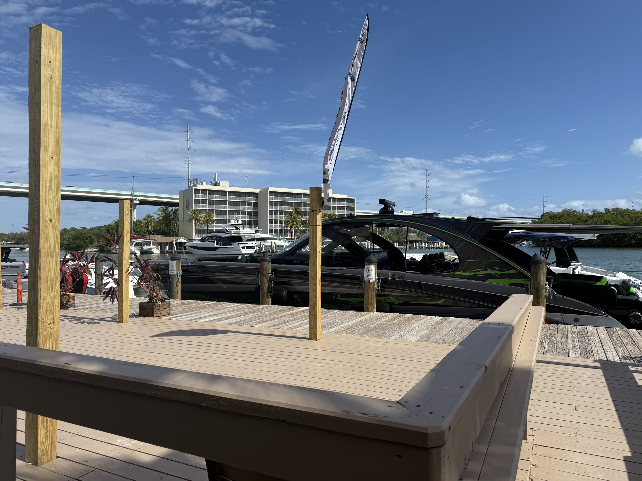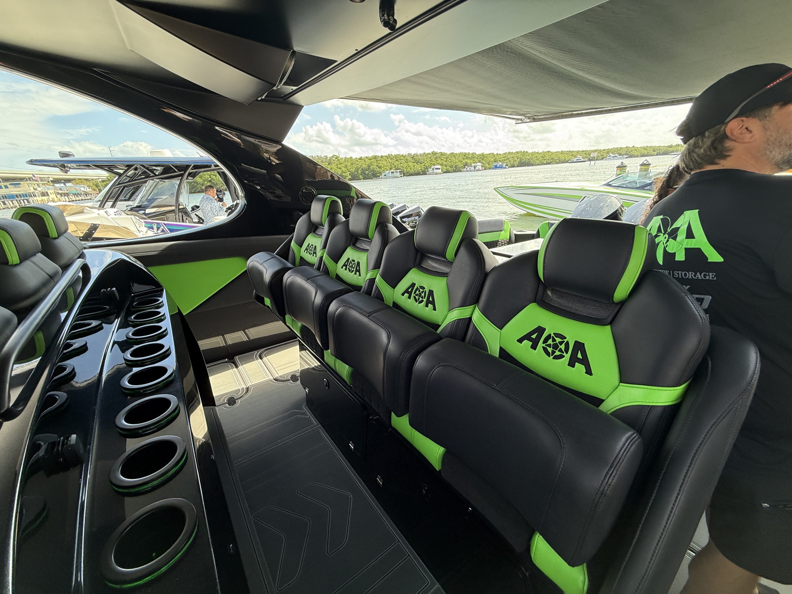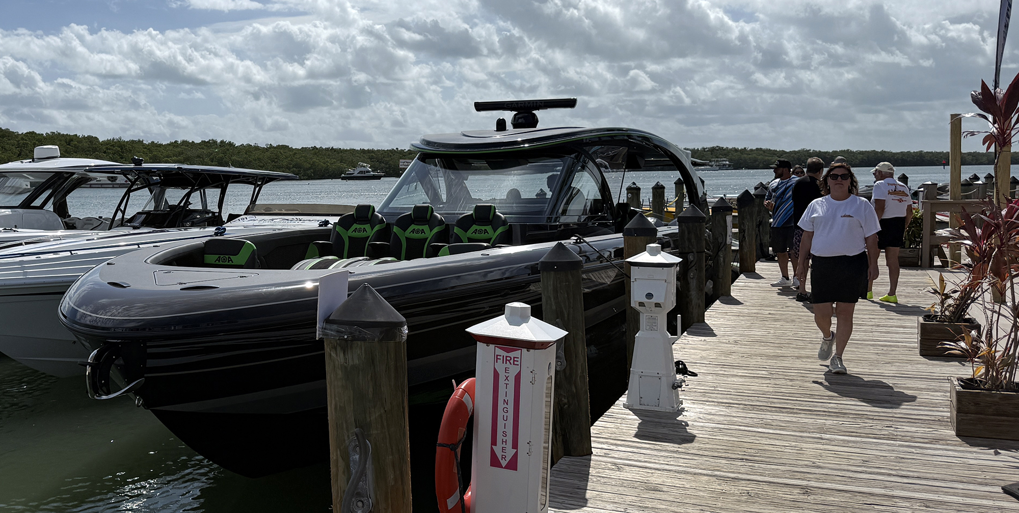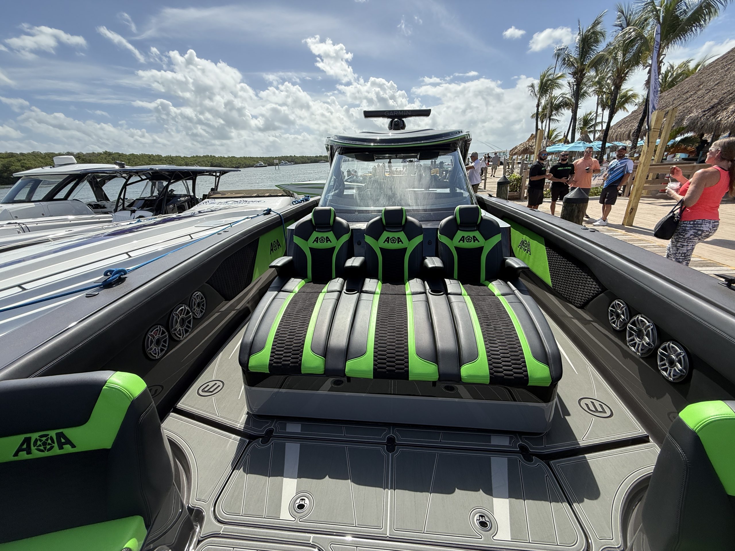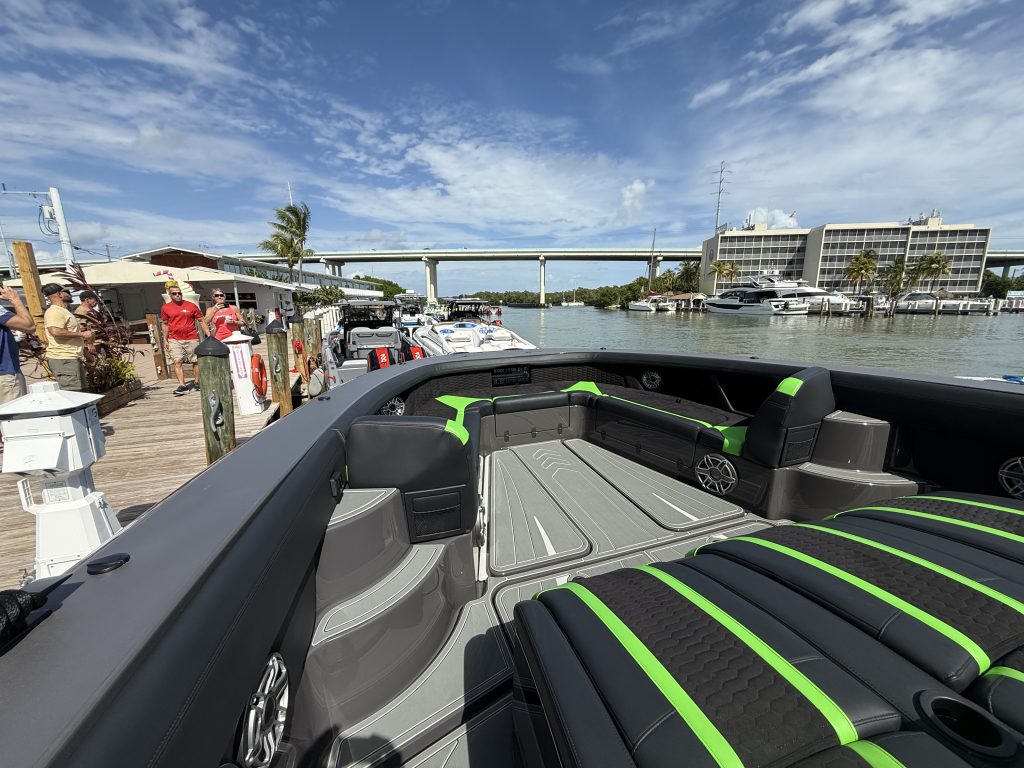 Docked at Gilbert’s Resort and Tiki Bar in Key Large, Fla., this afternoon as part of the fleet headed to the Florida Powerboat Club Key West Powerboat Week, the first M5200 center console—currently for sale at $2.6 million—from Angle of Attack Marine is the stunning proof of Richards’ vision for the Mystic brand. The quad V-12 Mercury Marine 600 outboard engine-powered 52-footer at the docks stopped club members and theirs friends in their tracks.