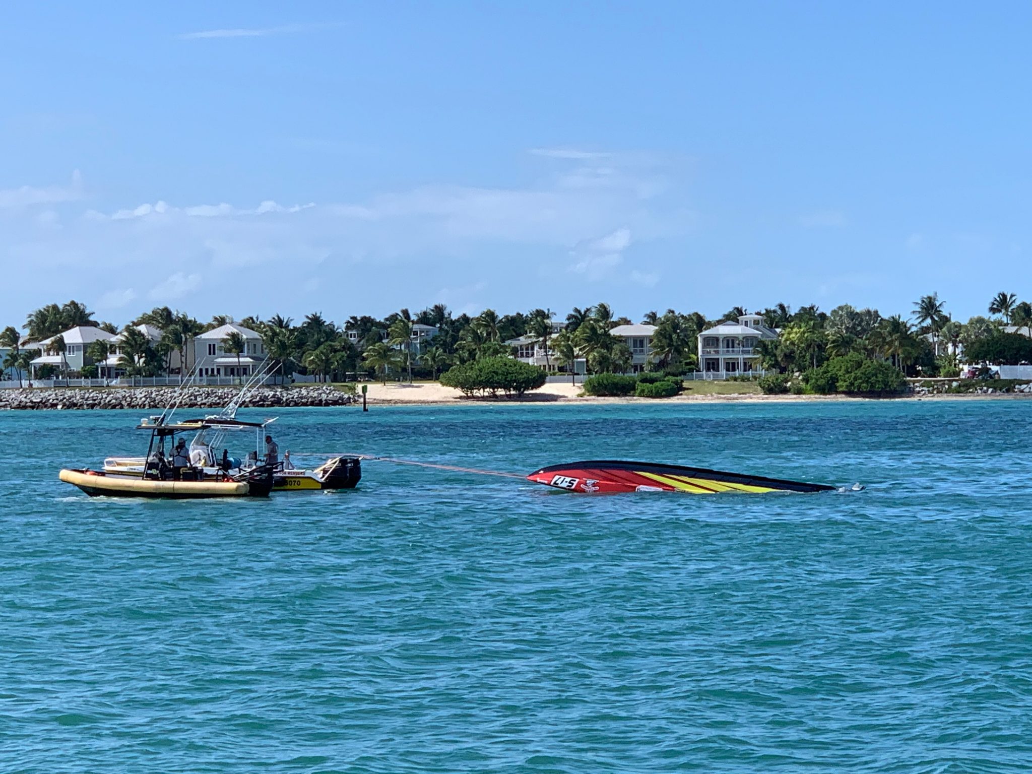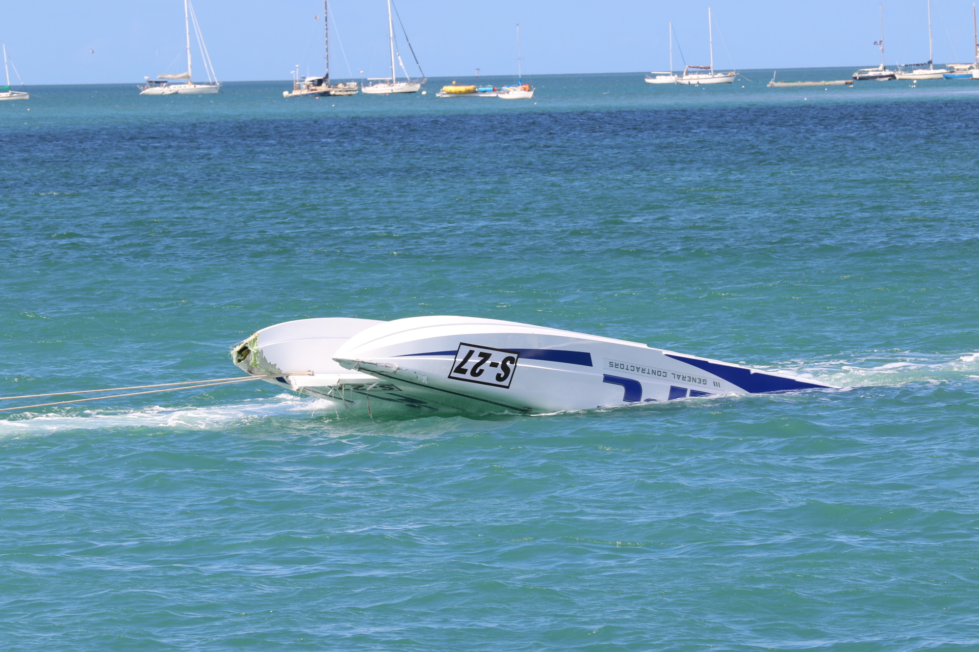 During the race, a pair of competitors were involved in an accident that saw the two boats running side by side, then appearing to each take too much air under the tunnel, blowing both over simultaneously. The two boats, Team Allen Lawn Care and LPC, went over completely and were towed in. There were no fatalities, but some team members in each boat suffered injuries and were being treated at press time. (See photos below.)