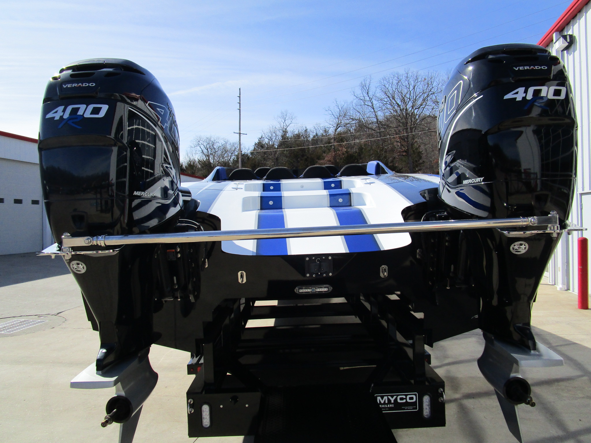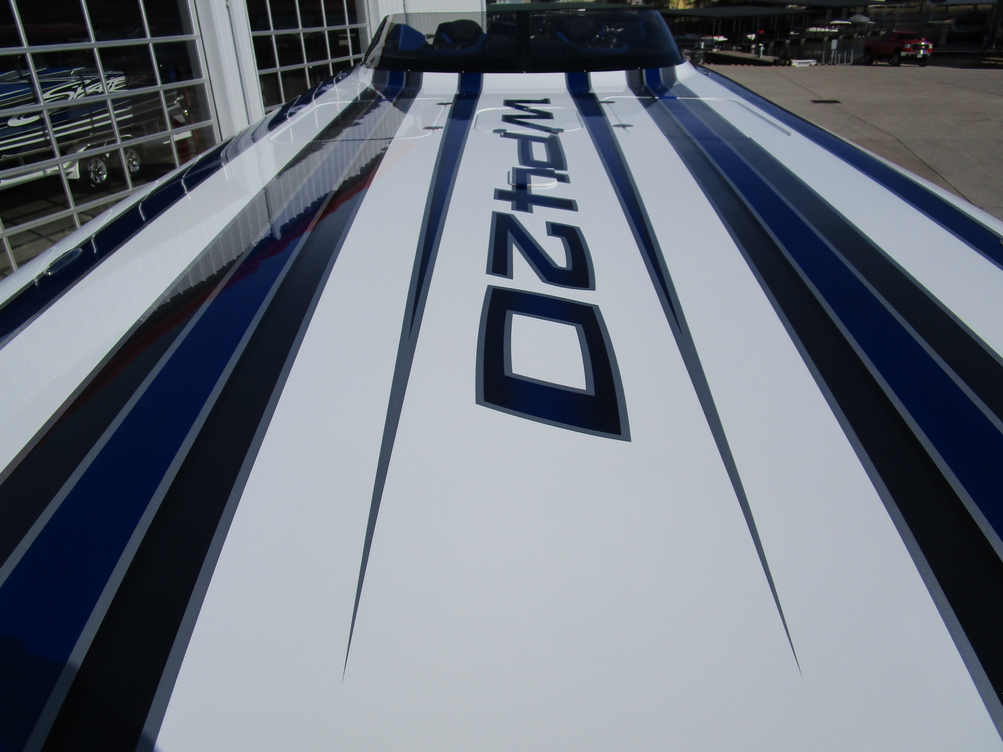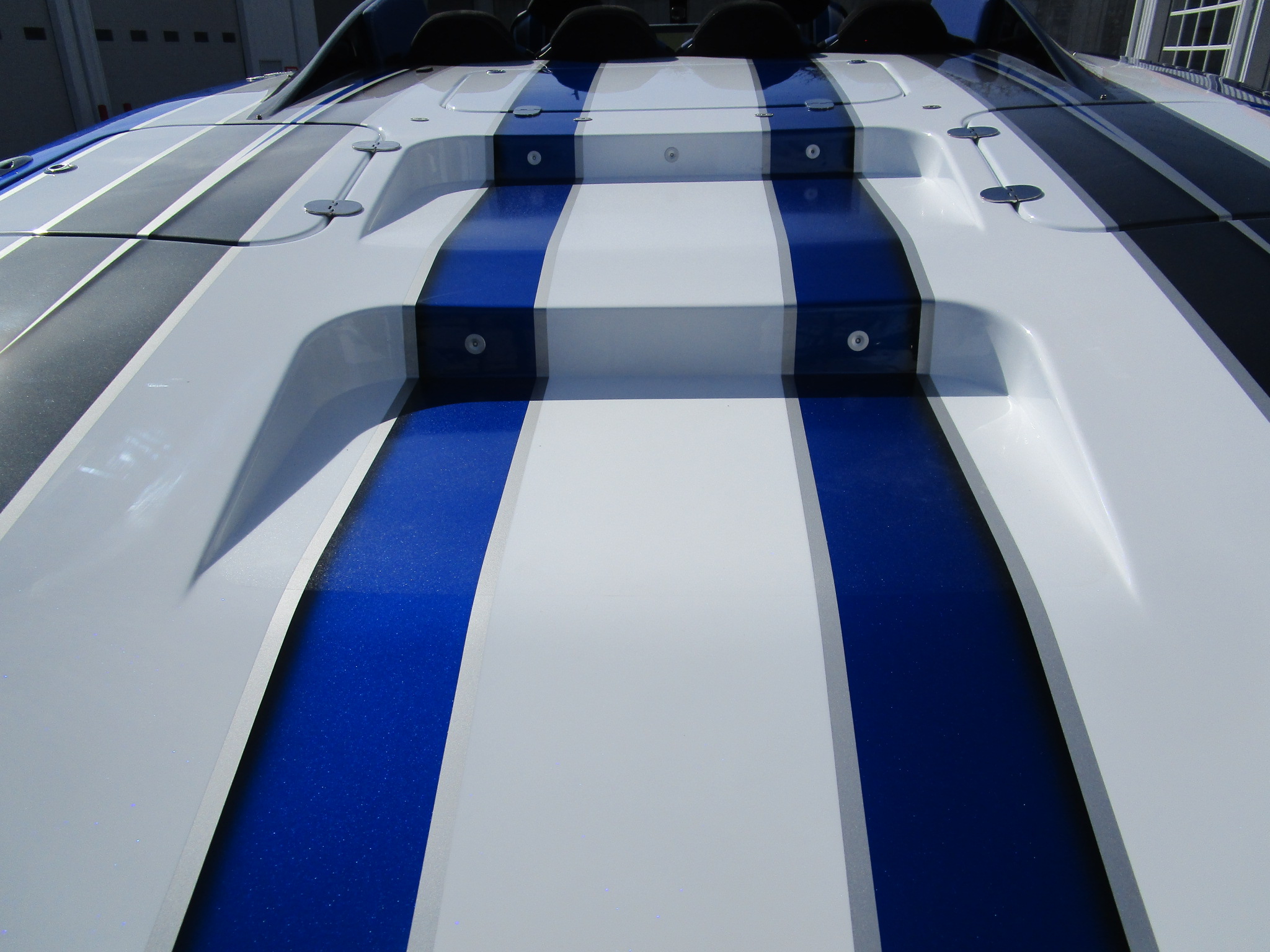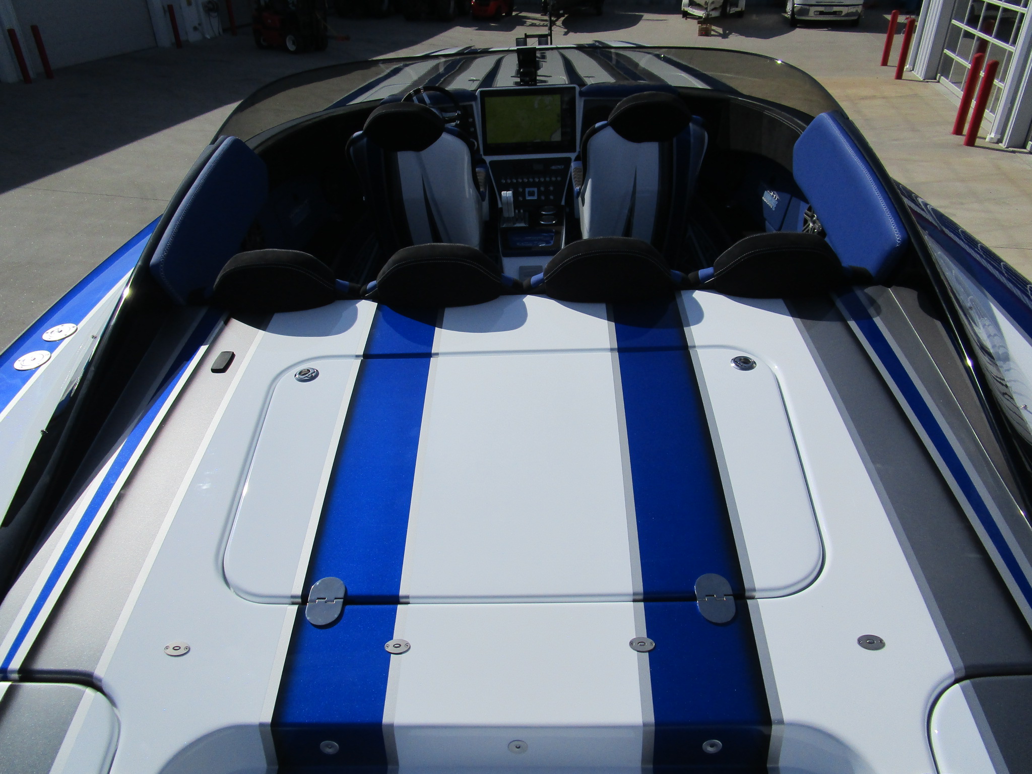 The 420 that showgoers will see is hull number one. It is 11 percent bigger in all aspects than the 360, with the exception of the tunnel. Performance Boat Center stayed with a conservative 66” tunnel to provide a high safety factor; the boat is said to ride completely flat. “We didn’t overcompensate with a big tunnel,” Manire says. “We’re still able to get good speeds out of it.” Manire said the boat has been tested at 116 mph as powered by twin Mercury Racing 400R Verado outboards.